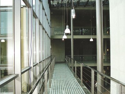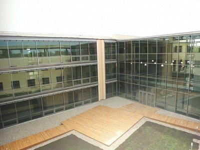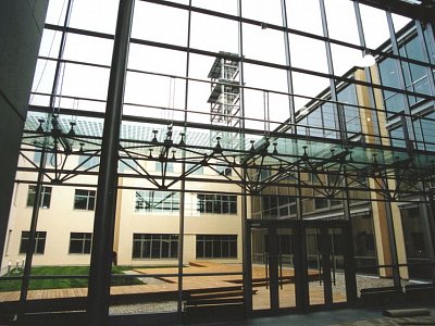 | Popis | Podzemní část stavby je chráněna vnější fóliovou dvouvrstvou hydroizolací proti průniku spodnícdh vod s aktivním kontrolním systémem. Stavba je založena na železobetonové vaně z vodostavebního betonu. Konstrukční systém je železobetonový skelet se ztužujícími stěnami, výtahovými šachtami a schodištěm. Fasáda je z poloviny provedena armovanou stěrkou, na zbývající části je skleněná samonosná fasáda systému Jansen. Vnitřní příčky jsou většinou sádrokartonové, stěny jsou opatřeny tenkovstvou stěrkou. Podlahy jsou zdvojené, dutinové nebo klasické, pokryté kobercovými čtverci, nebo dlažbou. Podhledy stropů tvoří minerální desky. V prostoru dvorany, schodišť a podest jsou pohledové betony. Střecha byla navržena jako horizontální s ustupujícími atikami. Hydroizolační funkci střechy plní PVC fólie chráněná vrstvou tříděného kačírku. |
