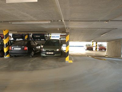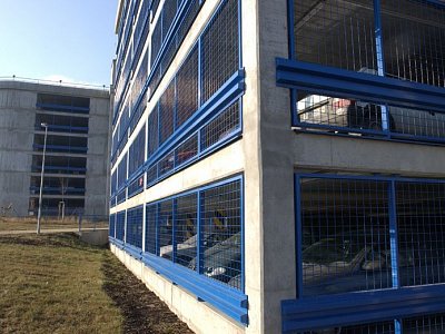 Obě stavby jsou založeny na vrtaných pilotách, které nesou základovou desku. Celá spodní stavba včetně výtahových šachet je do úrovně první-ho nadzemního podlaží vystavěna z vodostavebního betonu s těsněním pracovních spár. Tedy naší osvědčenou technologií bez vnějších hydroizo-lací. Oba garážovací objekty mají shodně pět nadzemních podlaží a po-jížděnou střechu. Konstrukčně to jsou monolitické železobetonové skelety kombinované s železobetonovými nosnými stěnami a sloupy. V místech, kde není obvodový plášť tvořen nosnou železobetonovou konstrukcí, jsou do fasády vsazeny ocelové rámy s drátosklem a mřížemi. Jednotlivá podlaží jsou rozdělená vždy na dvě části, výškově posunuté o polovinu své konstrukční výšky a spojené rampami. Pro pěší provoz jsou v každém objektu dva osobní výtahy a dvě schodiště. Svislé prostory pro schodiště opticky vystupují z hmoty objektů a tvoří jejich významný architektonický prvek. Značná část betonářských prací probíhala v zimním období. Vedení stav-by ale bylo na betonáže za nízkých teplot dobře připraveno. Mělo zpra-covaný podrobný plán zimních opatření, diferencovaně pro čtyři různá pásma aktuálních nízkých teplot. Byly použity receptury vhodné pro nízké teploty, byla kontrolována teplota dodávané betonové směsi a přede-vším byl beton důsledně chráněn polystyrénovými rohožemi a geotextilie-mi. Výsledkem byla nejen plynulá výstavba a všeobecně dobrá kvalita betonových konstrukcí, ale i kvalitní povrchy stavby, které v převážné míře vyhovují obecným požadavkům na pohledový beton. Hromadné garáže jsou celkově řešeny jako moderní provoz se stálou obsluhou. Vjezd a výjezd je vybaven závorami, identifikačním systémem a informační cedulí o obsazenosti garáží. Celý prostor je navíc sledován několika desítkami kamer. Garáže nejsou vytápěny, ale pro zajištění bez-pečného provozu mají komunikační rampy zabudované elektrické vytá-pění, které uvádějí do činnosti čidla jakmile klesne teplota povrchu ramp pod nebezpečnou hranici. Podobně je automaticky kontrolována kon-centrace výfukových plynů v ovzduší a v případě potřeby se automaticky zapíná větrání. Z dalších zajímavostí můžeme jmenovat automatické roz-svěcení a zhasínání vnitřního osvětlení, elektricky ohřívané střešní vpustě, kvalitní sociální zázemí aj. Garáže postavil kolektiv stavbyvedoucího Martina Beneše za necelých 9 měsíců. Přestože jsou v provozu teprve málo přes půl roku, je zřejmé, že úroveň jejich prací i subdodávek vytvořily kvalitní dílo, které je dobrou vizit-kou firmy. Celkově příznivý dojem podtrhují i sadové úpravy a zpevněné plochy v bezprostředním okolí obou staveb, které navíc přispívají k urbanistické integraci garáží do stávající zástavby. |