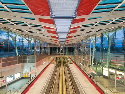 Druhá etapa sestávala ze tří stanic a navazujících tunelových úseků. Vlastní stanice je výrazným architektonickým objektem dle návrhu Ing. Arch. Patrika Kotase. Jedná se o povrchovou (hloubenou) stanici, kdy konstrukce spodní stavby je řešena jako klasická železobetonová konstrukce. Nejvýraznějším prvkem stavby je ocelová konstrukce vlastní stanice, kterou tvoří soustava obloukových vazníků (rozpětí cca 160m), zavěšené skleněné střechy a skleněné fasády. Součástí stanice jsou také terénní úpravy vstupních prostor s mimoúrovňovými lávkami pro pěší schodišti a vodními kaskádami. V rámci stavby bylo také vybudováno záchytné parkoviště. |