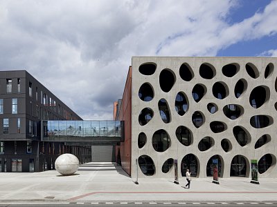 Nové divadlo láká k návštěvě i svou netypickou podobou. Výrazným architektonickým prvkem je vstupní fasáda evokující divadelní oponu, která se v mírném úhlu 11,2 stupně naklání nad příchozí a vyzývá je ke vstupu do vnitřních prostor divadla. „Oponu“ o rozměrech 21,8 x 13,8 x 0,60 metrů tvoří 40 nepravidelných bublin, třemi z nichž se do budovy vchází. Dominantním materiálem použitým v exteriéru divadla je pak litý pohledový beton probarvený do červeného odstínu. V průběhu 114 jednotlivých betonáží bylo na stavbu denně dodáváno 2,5 až 8 metrů krychlových betonu barveného speciálním anorganickým pigmentem, který byl dovezen po moři z USA. Na stavbě se denně pohybovalo zhruba 250 pracovníků dodavatelské společnosti HOCHTIEF CZ a jejích subdodavatelů.